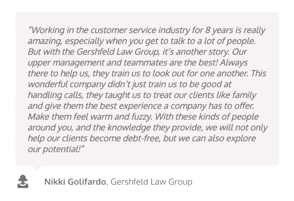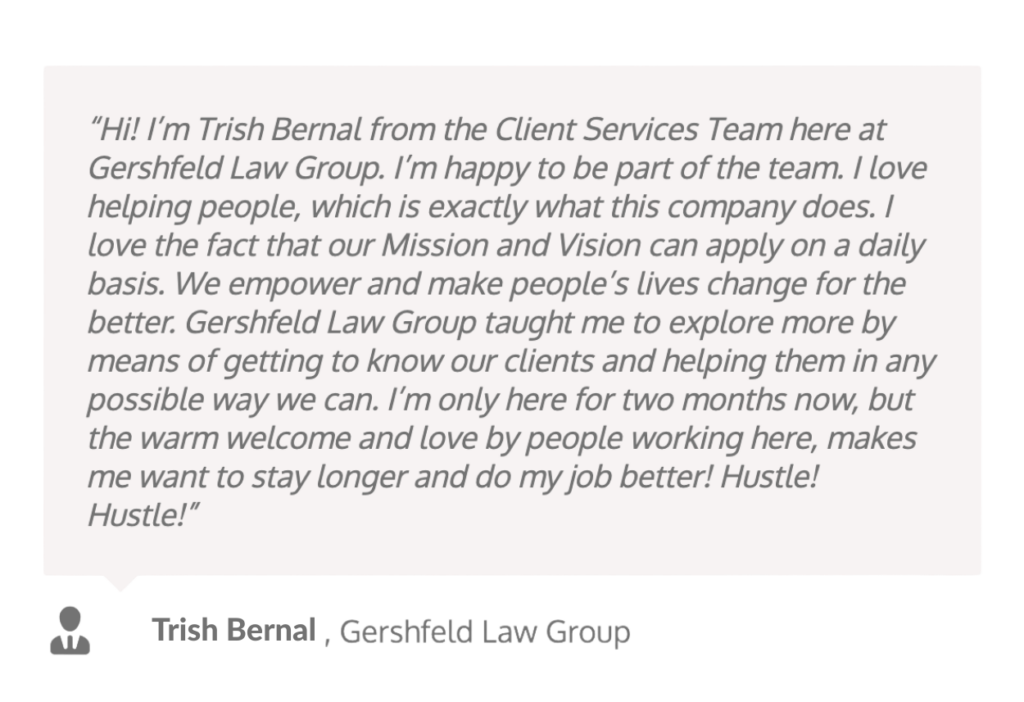 At Gershfeld Law Group you will find a culture of honorable, competent, high-functioning teams that work seamlessly together. Our team members all possess a strong desire to grow and improve, both personally and professionally. Gershfeld Law Group provides the training, resources, and tools to foster that growth. We pride ourselves on providing an environment where trust, respect, good communication, and great leadership are core values. The best part is, we have become one, big, happy family that genuinely enjoys and cares about one another.